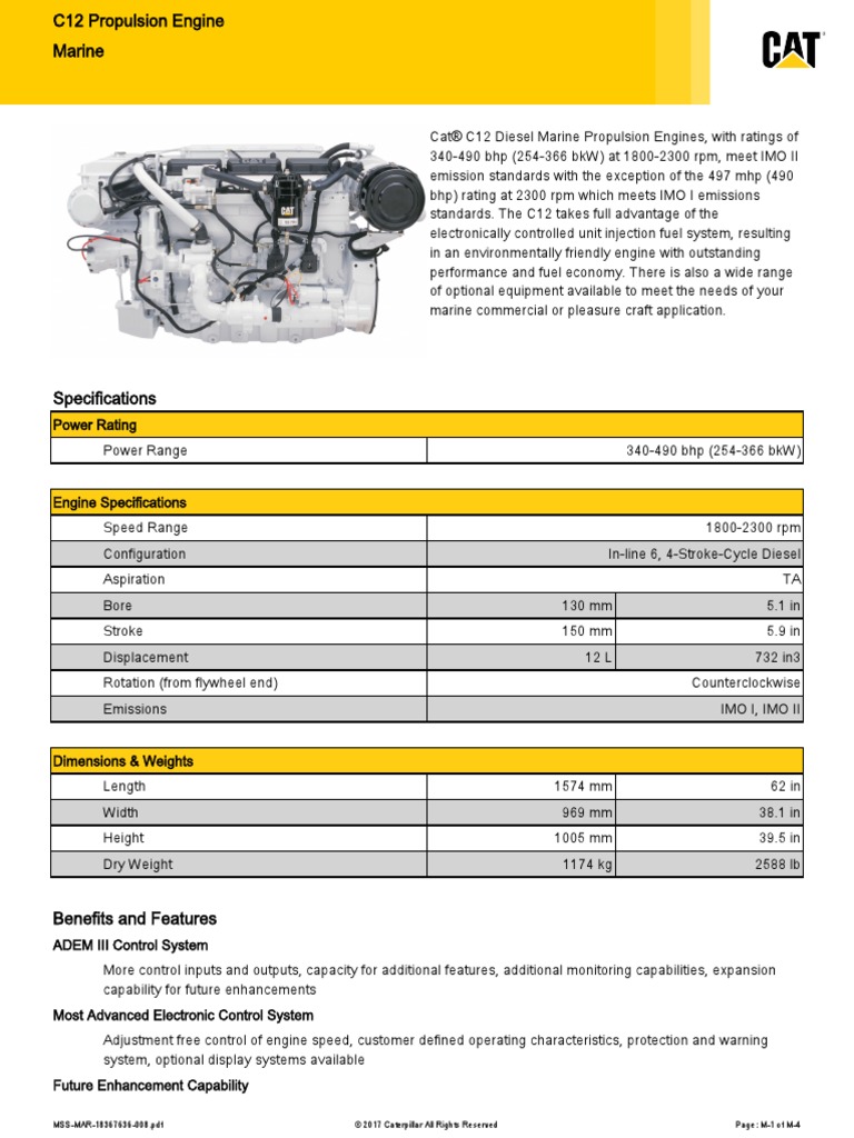 Viewing a thread - Cat C12 oil capacity Cat C12 Diesel Marine Propulsion Engines with ratings of 340-490 bhp 254-366 bkW at 1800-2300 rpm meet IMO II emission standards with the. It is recommended that oil drain. Cat C12 Diesel Marine Propulsion Engines with ratings of 578-609 mhp 570-600 bhp at 2300 rpm meet IMO I emission standards.